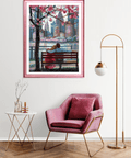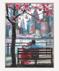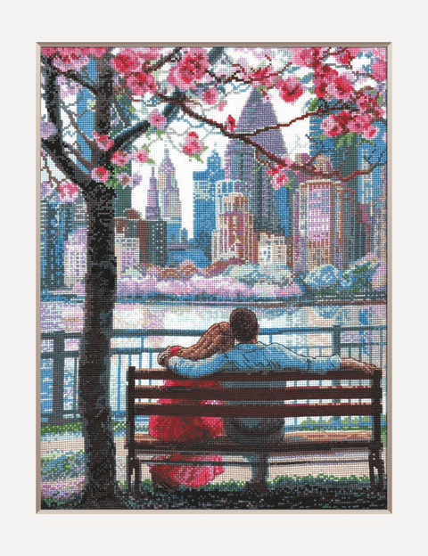 „Aine“ kryželiu siuvinėjimo rinkinys „Žydintis Niujorkas“ – pavasariška miesto romantika viename dizaine. Parko suoliuke įsitaisiusi pora grožisi vyšnių žiedais, o fone – atpažįstama Niujorko panorama, kuri kuria jaukią, elegantišką nuotaiką.
