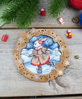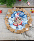 Kryželiu siuvinėtas darbas ant medžio „Užšalusi upė“ – miniatiūrinis žiemos peizažas, kuris suteikia jaukumo interjerui ir puikiai tinka dovanai.