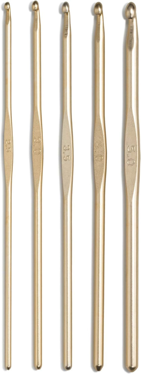 Šiuolaikiškas nėrimas! Šiuose vilnos nėrimo kabliukų rinkiniuose yra po penkis naujos madingos aukso arba bronzos spalvos kabliukus. Šias dvi patrauklias spalvas galima rasti tik šiuose rinkiniuose! Be abejo, jie yra populiaraus pločio - nuo 2,50 mm iki 5,00 mm, kad galėtumėte iš karto pradėti kitą nėrimo projektą. Ant kotelio esantis kreipiamasis paviršius užtikrina, kad kabliukas neslystų rankoje, ir patikimai leidžia megzti lengvai ir tiksliai. Dėl labai lygaus paviršiaus ir tobulos kabliuko formos siūlai vedami tolygiai; taip šis nuostabiai lengvas aliumininis nėrimo kabliukas užtikrina tolygią dygsnio struktūrą. Praktiško, patvaraus plastikinio laikymo maišelio baltas fonas nuostabiai kontrastuoja su blizgančiais nėrimo kabliukais. Šis rinkinys taip pat yra puiki dovana!