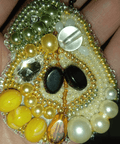 - Medžiagos: stikliniai karoliukai, kristaliniai akmenėliai, veltinis, metalinė viela, metalinis užsegimas