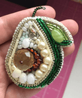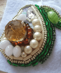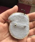 Matmenys: 5 × 7 cm (1,97 × 2,76 in). Medžiagos: stikliniai karoliukai, kristalai, veltinis, metalinė viela, metalinis užsegimas. Spalvų derinys paryškina išskirtinį avokado motyvą.