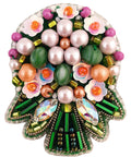 Medžiagos: stiklo karoliukai, veltinis, metalinis užsegimas, dekoratyviniai elementai. Spalvos: mišrios (puokštės derinys). Pritaikymas: segės gamyba ir dekoratyvinis siuvinėjimas ant pagrindo.
